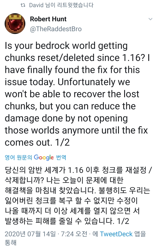 마인크래프트 개발자 TheTaddestBro께서 우리는 마침내 해결법을 찾았다. 아쉽게도 잃어버린 청크는 복구가 불가능하지만 수정버전이 나올 때까지 더이상 세계를 열지않는다면 발생하는 피해를 줄일 수 있다고했습니다.