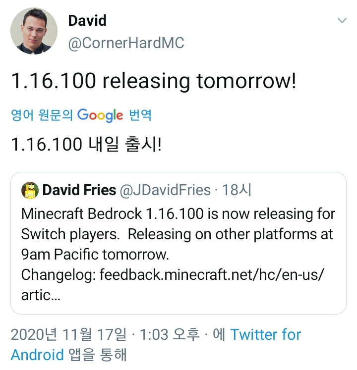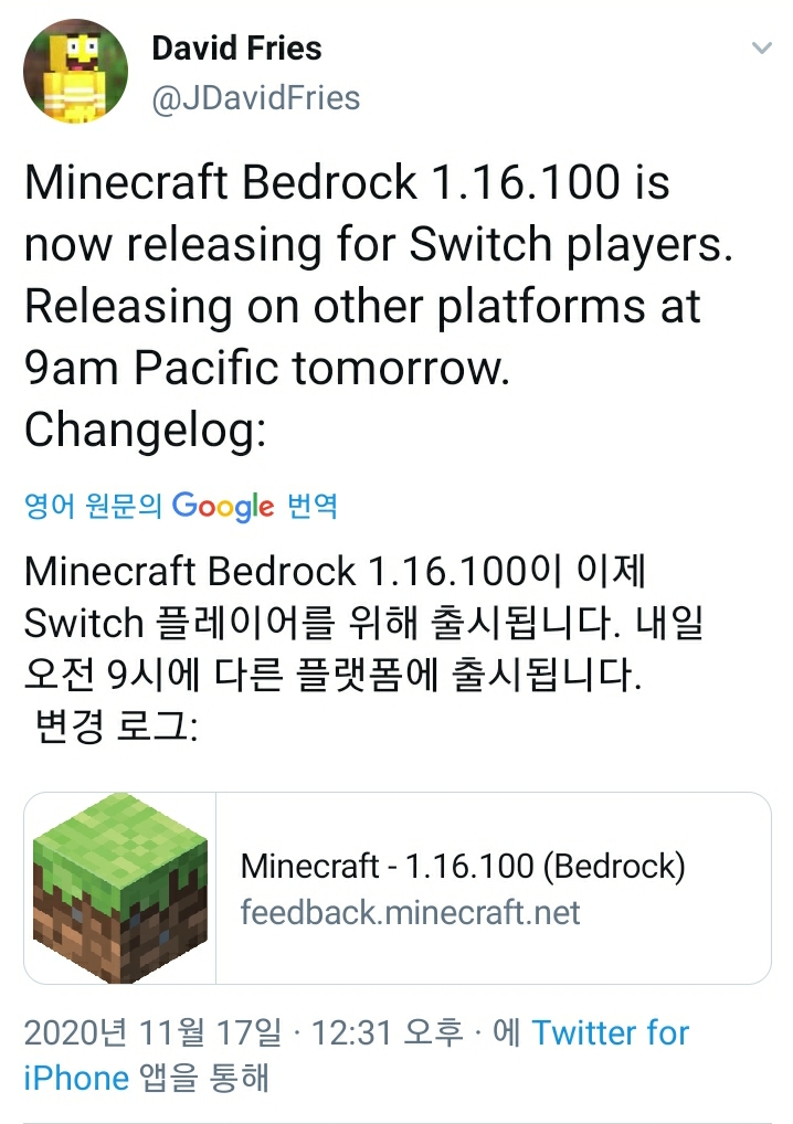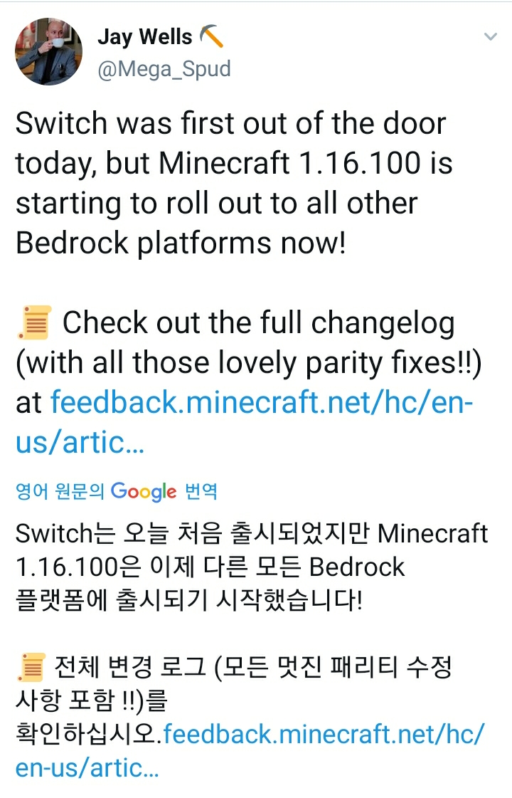 | MINECRAFT JAVA 에디션 1.16.4 Minecraft Java 1.16.4 출시 (0) | 2020.11.04 |