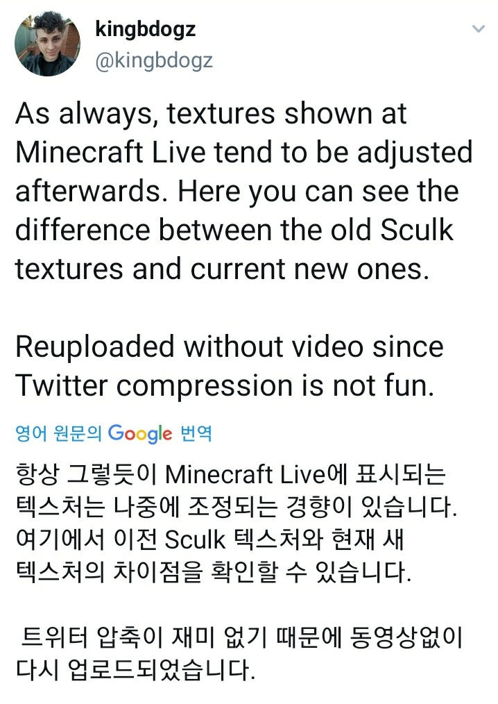 마인크래프트 개발자가 "항상 그렇듯 마인크래프트 라이브에 표시되는 텍스쳐는 나중에 조정되는 경향이 있으며 여기서 이전 스컬크의 텍스쳐와 현재 새로나올 텍스쳐의 차이점을 알 수 있습니다."라고 언급했습니다. 하지만 제 눈에는 살짝 진해진거밖에 못느끼는거같습니다.(사실 똑같아보입니다.)
