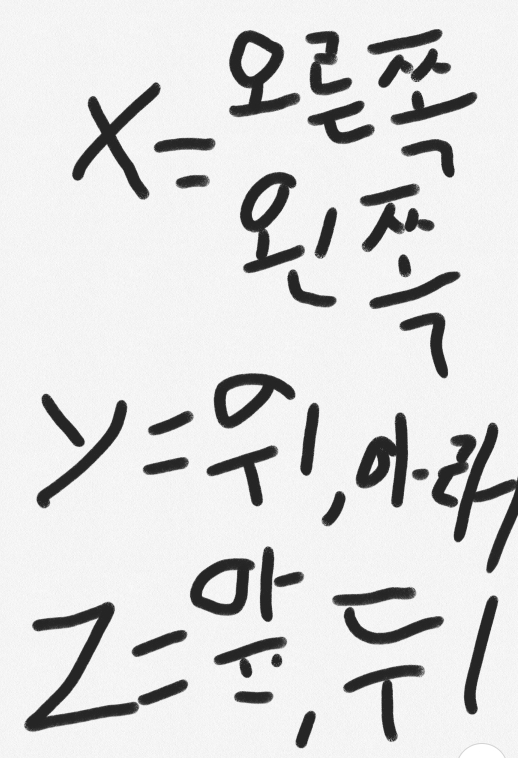 이건 주로어린이들을위해서 이사각형과 아래설명은 연결이됩니다 이 직사각형은 (네모박스)는 xyz가 쉽게 구분되어있습니다 x는 바닥선중 앞부분 그리고 그 건너편 즉 평행하는 선이 x 이며 x옆집에있는녀서은 약간의 대각선같이 기울여져있는 Z이며 이것은 앞뒤분분으로 위에있는 좌표평면을 보면알수있다 위에있는그림을 말하는거다 그리고 z옆집y는 우주로 갈듯한 높이라는 것이다 한마디로 땅과 하늘이다 바다는 x이고 z는 딱히 예를 들게없으니 풀로넣어준다 암튼이렇게 xyz를 보면딱 알수있다