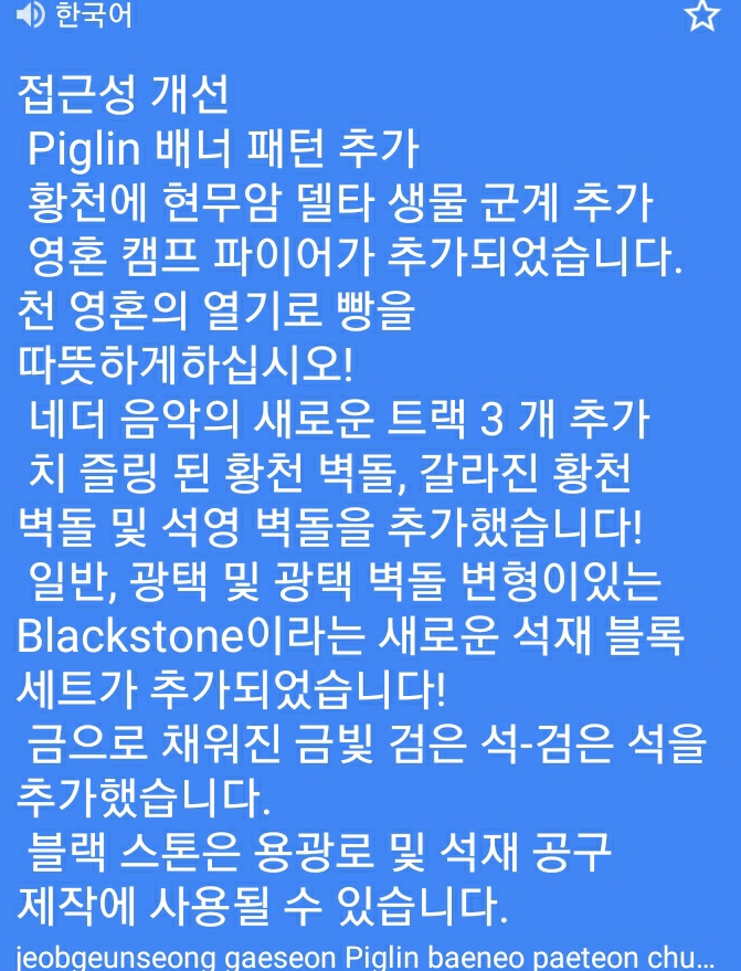 가장크게 추가된건 검은돌,석영벽돌,갈라진 네더 벽돌,검은 돌 조각하고 4개로조합되는 광택블럭과 활공된 블랙스톤까지이며 네더전용음악이 생겼습니다