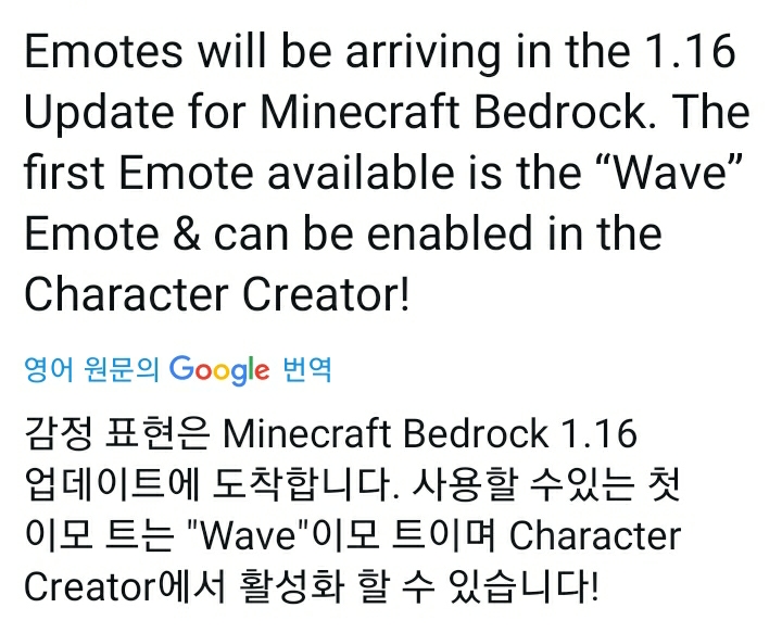 2번째소식 마인크래프트BE.PE를 쓰시는분들이 이모트를 쓰실날이 얼마안남았습니다 저기있는 베타버전같은경우에는 베타 1.16.0.57입니다 즉 지금버전이 이거랑 같은걸로알고있습니다 그래서 스토어가보시면 무료로 팩을판매하고있거나하겠죠 저는 지금 컴킬상황이아니라서 암튼 여기까지가 큰 내용이겠네요 RTX마인크래프트가 벤치용게임이 된다면 더 큰 희망이 생기겠네요 마크가 할인을 할수도???