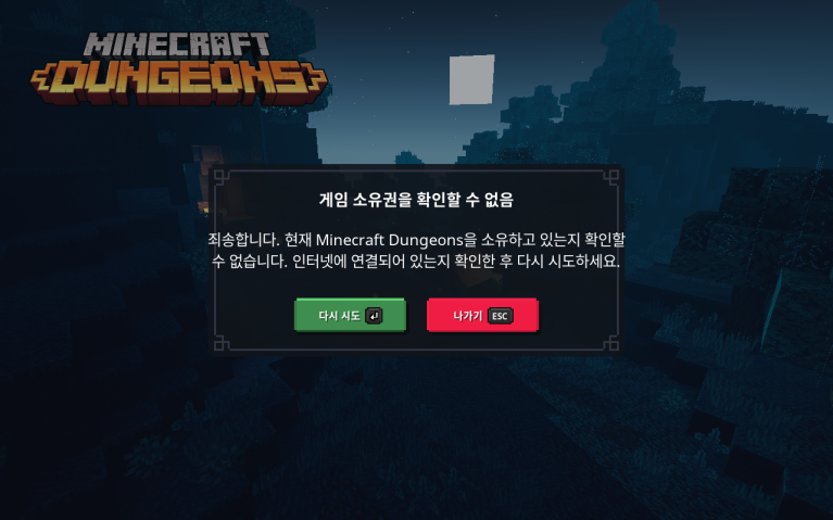 게임 소유권을 확인할 수 없음 죄송합니다. 현재 Minecraft Dungeons을 소유하고 있는지 확인할 수 없습니다. 인터넷에 연결되어 있는지 확인한 후 다시 시도하세요. 마인크래프트 던전스가 버그가 ��