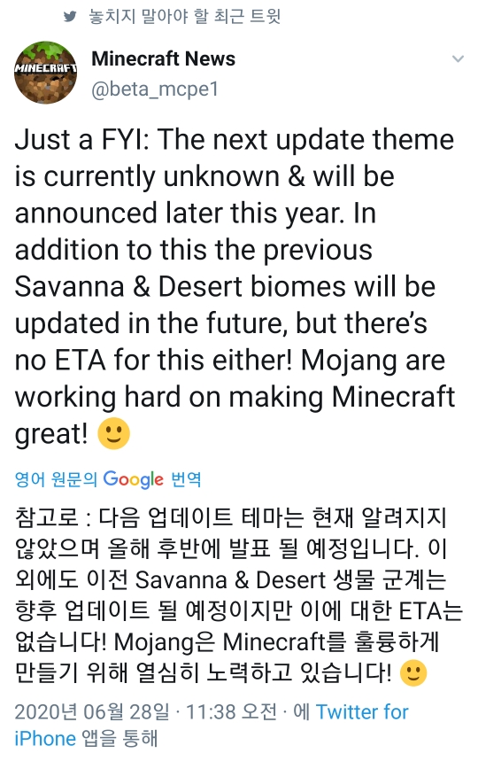 마인크래프트 다음 업데이트는 예정되어있지 않다!!