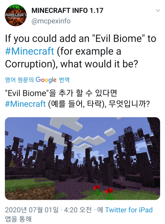 저는 악바이옴에는 보라색 좀비나 새로운 광물:자수정같은 이런식의 광물이 추가되었으면 좋겠습니다. 또한 새로운 보스는 레드드래곤과 좀비피그린의 대장느낌의 보스가 나왔으면 좋겠다는 생각이 문뜩 드네요 ㅎㅎ