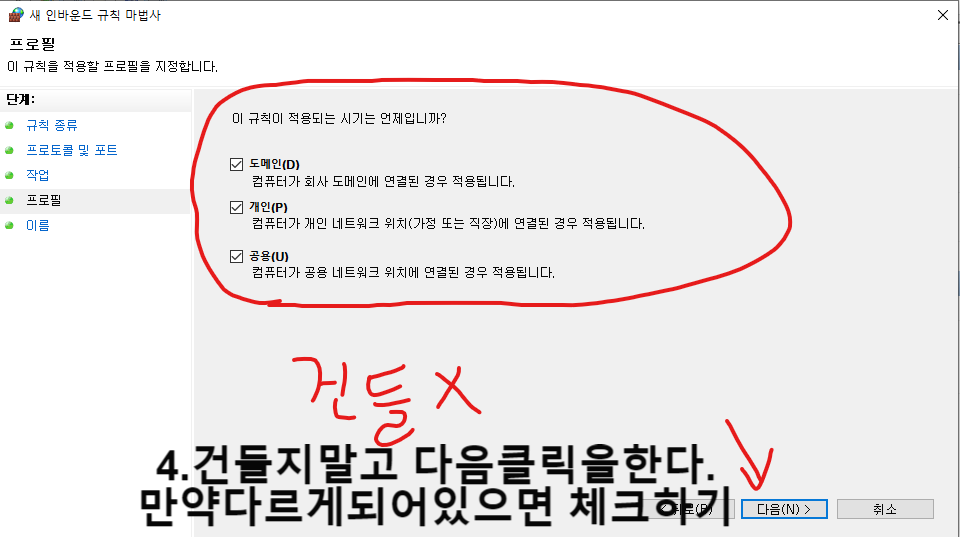 3.여기서 부터는 4번까지 아무것도 누르지말고 다음을 누른다. 또한 네트워크가 공용이 아니고 개인일 경우 개인으로 설정하면 될 것이다.(네트워크 설정을 개인으로 하는 것은 추후의 설명을 넣어주겠습니다.)