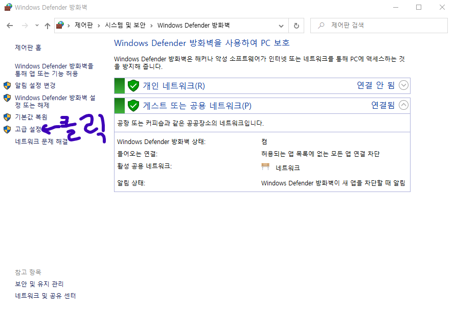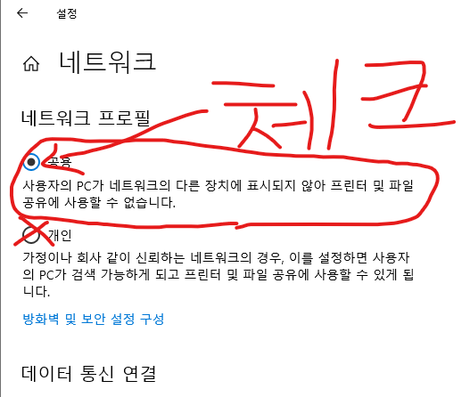 아마도 들어간다면 이런 화면이 둘중하나에 있습니다. 일단 제가 클릭을 많이 한 결과 1번사진에 많이 들어가지기 때문에 만약 2번사진화면이 나왔다면 네트워크 연결됨을 클릭하셔서 개인으로 설정되어있다면 공용으로 바꿔주시면 감사하겠습니다. 사실 저도 구분을 잘 못하지만 제가 개인으로 했을 때는 절대 포트포워딩이 안되어서 그냥 공용으로 해주시면 감사하겠습니다. 이렇게하고
