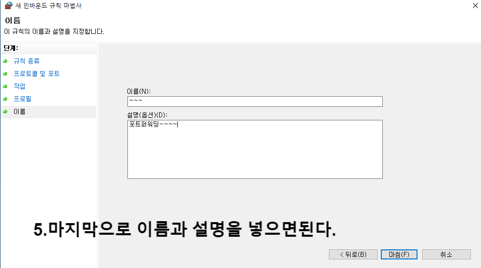 5.이름과 설명을 넣는다. 이름은 무조건 넣어야하고 이름을 쓸 때 포트포워딩이라고쓰면 보기쉽기때문에 포트포워딩이라고 쓰는 것을 추천하며, 설명은 날짜로해서 어떤날에 했는지 일지처럼 적으면 보기쉬울거같다.