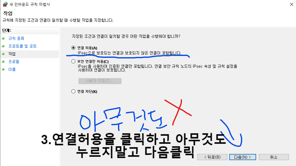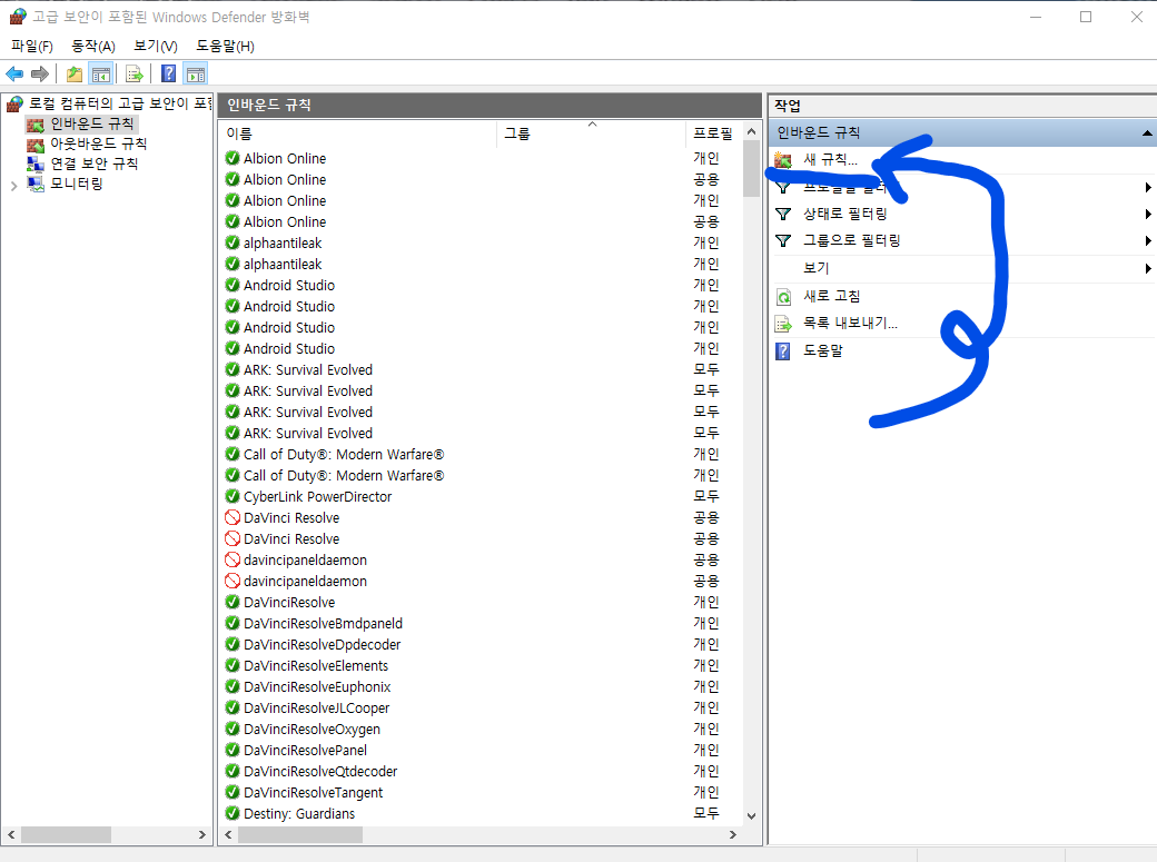 인바운드 규칙을 클릭한 후 새규칙을 누른다.