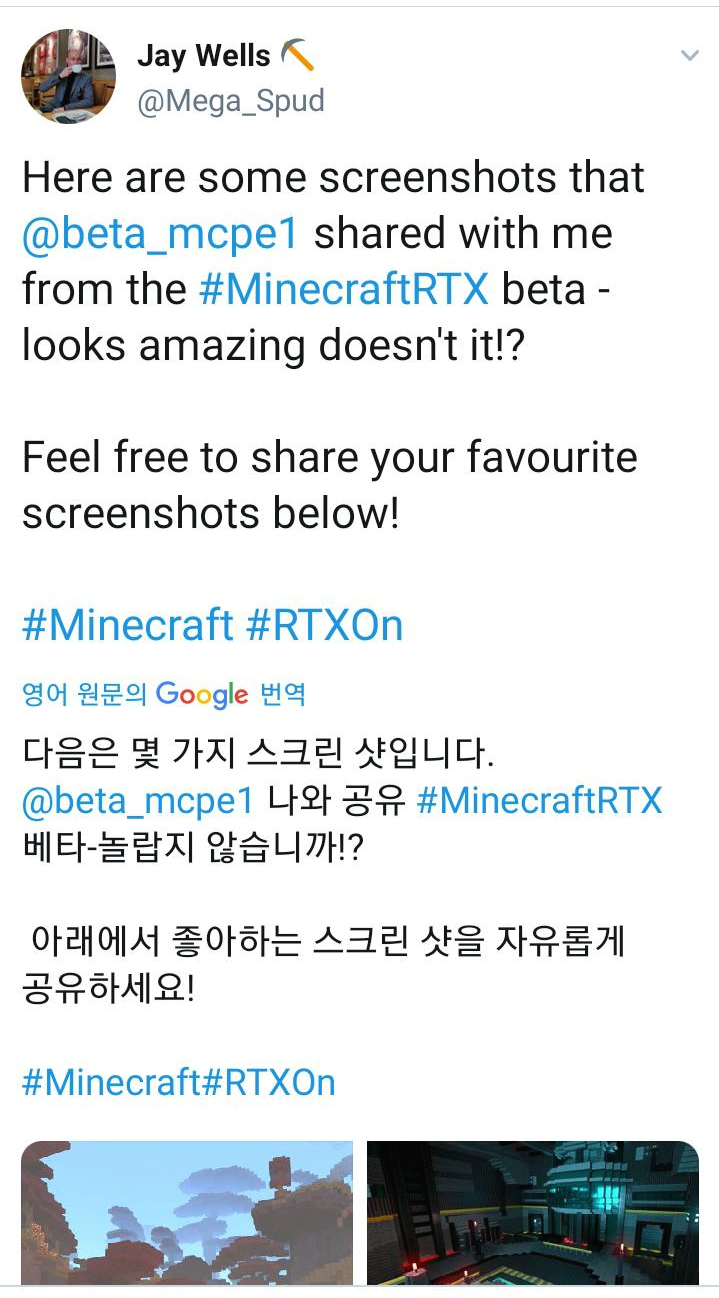 세번째 소식 RTX버전의 새로운 맵이 추가됩니다. RTX베타가 한번더 업데이트됩니다. 마인크래프트 RTX베타는 그래픽카드 RTX2060처럼 RTX의 이름태그를 가질 수 있는 그래픽카드 한에서 지원됩니다. 그러면 GTX버전의 그래픽카드로는 불가능하냐고 말할 수 있는데 제가 실험영상을 찾아본 결과 없습니다. 나중에 기회가 된다면 관련영상을 찍을거지만 일단 지금 찍기에는 그래픽카드를 산지 6개월도 안된 그래픽카드라서 테스트는 보류하도록하겠습니다. 그래서 이렇게 업데이트 내용은 총 두가지입니다.