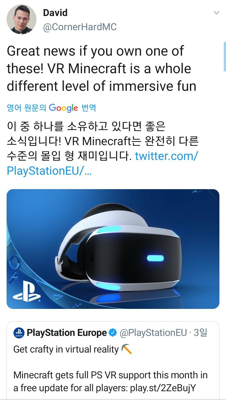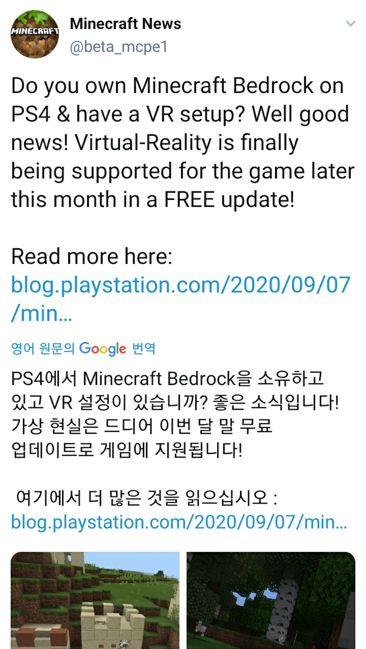 두번째 소식입니다. 마인크래프트 베드락에디션 플레이스테이션4에서 이번 달 말에 무료로 VR기능을 쓸 수 있습니다. 더 많은 내용을 보려면 ↓링크를 클릭해주세요^D^