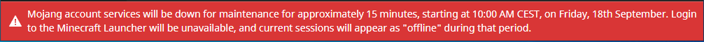 해석: Mojang 계정 서비스는 9 월 18 일 금요일 오전 10시 (CEST)부터 약 15 분 동안 유지 관리를 위해 중단됩니다. Minecraft Launcher에 로그인 할 수 없으며 해당 Perlod 동안 현재 세션이 "오프라인"으로 표시됩니다.