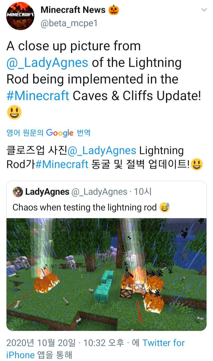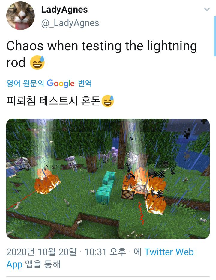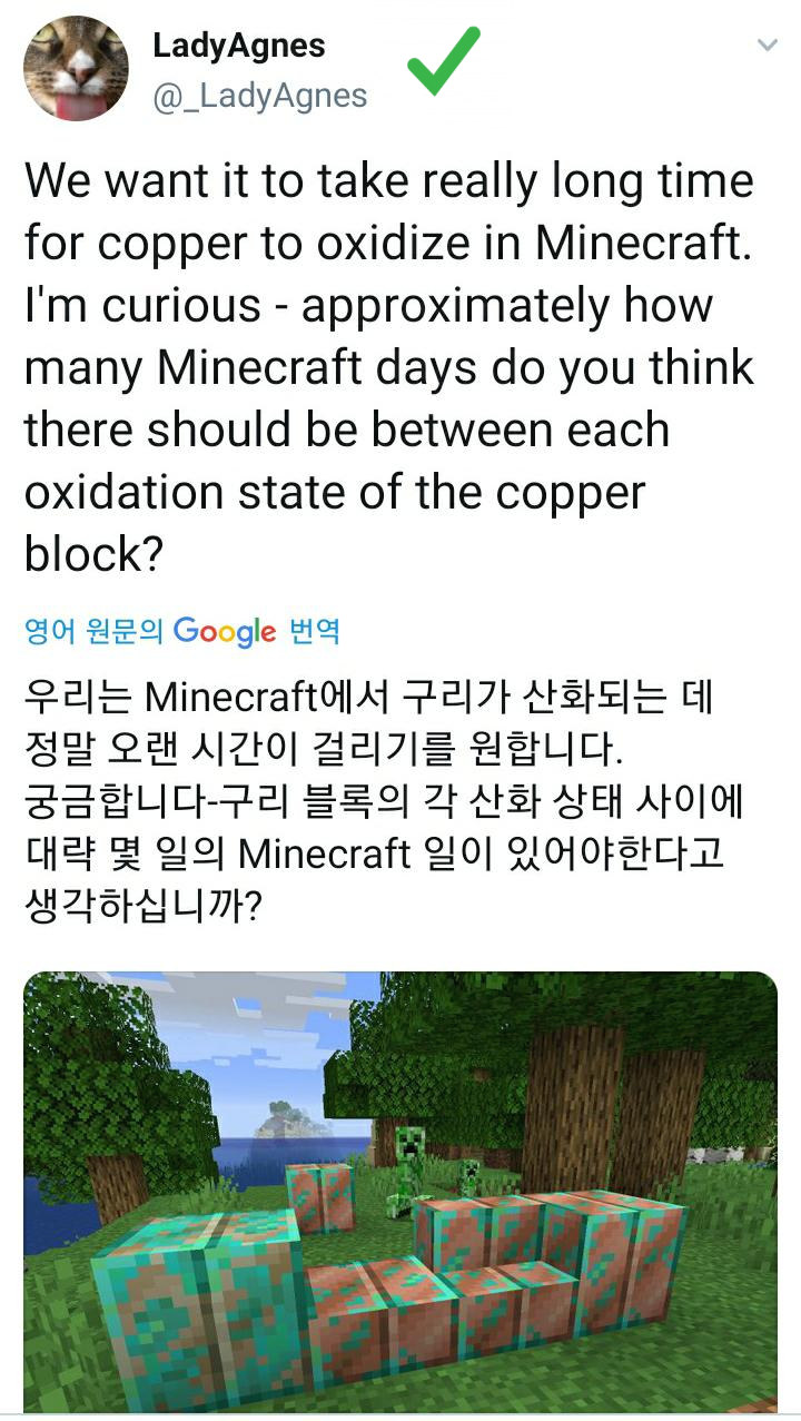 먼저 체크표시가 되어있는 것부터 보겠습니다.마인크래프트 개발자 Lady Agnes가 구리블럭은 마인크래프트에서 산화되는데 오랜 시간이 걸리길 원하며 구리블럭의 각 산화 상태 사이에 대략 몇 일의 마인크래프트 일이 있어야 한다고 생각하나요?라고 묻자 마인크래프트 100일은 20시간의 플레이 시간이므로 완전히 산화하는데 60시간이 걸리며 나는 그것이 세계의 역사를 보여주는 당신의 진술에 사실이라고 생각합니다.라고 답했습니다. 그런데 나는 "그것이 세계의 역사를 보여주는 당신"이라는 뜻은 해석이 잘안되네요. 그래도 해석해보자면 세계의 역사를 검색해보니까 선사시대부터 쭉 있던데 아마도 산화까지 왔다라는 뜻은 그만큼 문명이 많이 발전했기(?)때문에 구리의 시간을 그만큼 늘린게 아닐까 싶습니다.