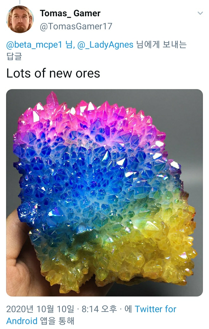체크가 없는 사진 즉 2020년10월10일 오후 8시14분을 보시면 lots of new ore라고 적혀져있는 것을 볼 수 있습니다. lots of new ore=많은 새로운 광석라는 뜻을 가지고있습니다. 즉 구리와 자수정말고도 이번이 동굴 업데이트인만큼 더 많은 광석들이 나올 수 있다는 떡밥을 뿌린 것입니다.