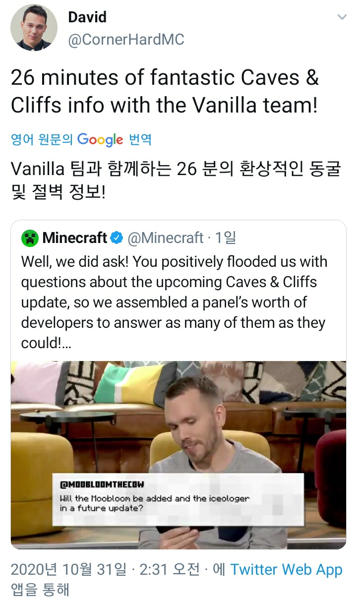 마인크래프트 바닐라팀과 26분동안 동굴과 절벽업데이트 정보를 유튜브링크를 통해서 알 수 있습니다.
