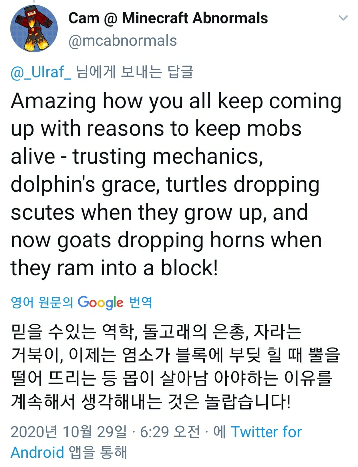 마인크래프트에서 염소의 뿔을 얻을려면 어떻게 해야할지 개발자들이 고민을하다가 독특한 방법으로 염소를 죽이지않고 뿔을 얻을 생각하다가 염소의 뿔을 얻을려면 블럭에 부딪힐 때 뿔을 떨어뜨리는 방법으로 결론을 내렸습니다. 따라서 마인크래프트에서는 염소의 뿔을 얻을려면 염소가 블럭에 부딪히도록 유도시킬 필요가있습니다.