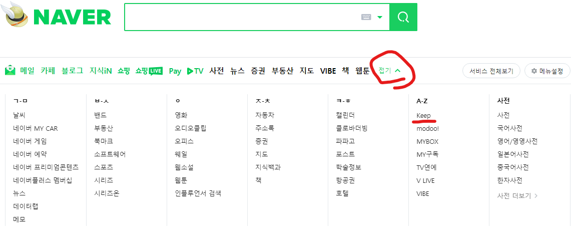 접기부분에서 A-Z라인에 맨 위에 있는 Keep버튼을 클릭합니다.