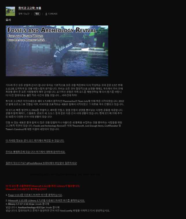 먼저 Fossils and Archeology: Revival - Files - Minecraft Mods - CurseForge로 들어가서 최신버전의 모드를 깔아 줍니다.