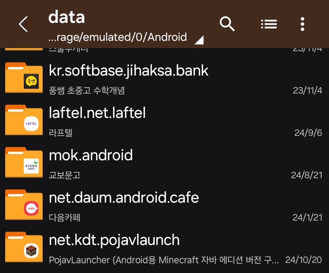 다음 단계로, 내장 메모리의 'android/data' 폴더로 이동한 후 아래로 스크롤하면 'net.kdt.pojavlaunch' 폴더가 보입니다. 이 폴더를 열고 '.minecraft' 폴더를 선택하세요.