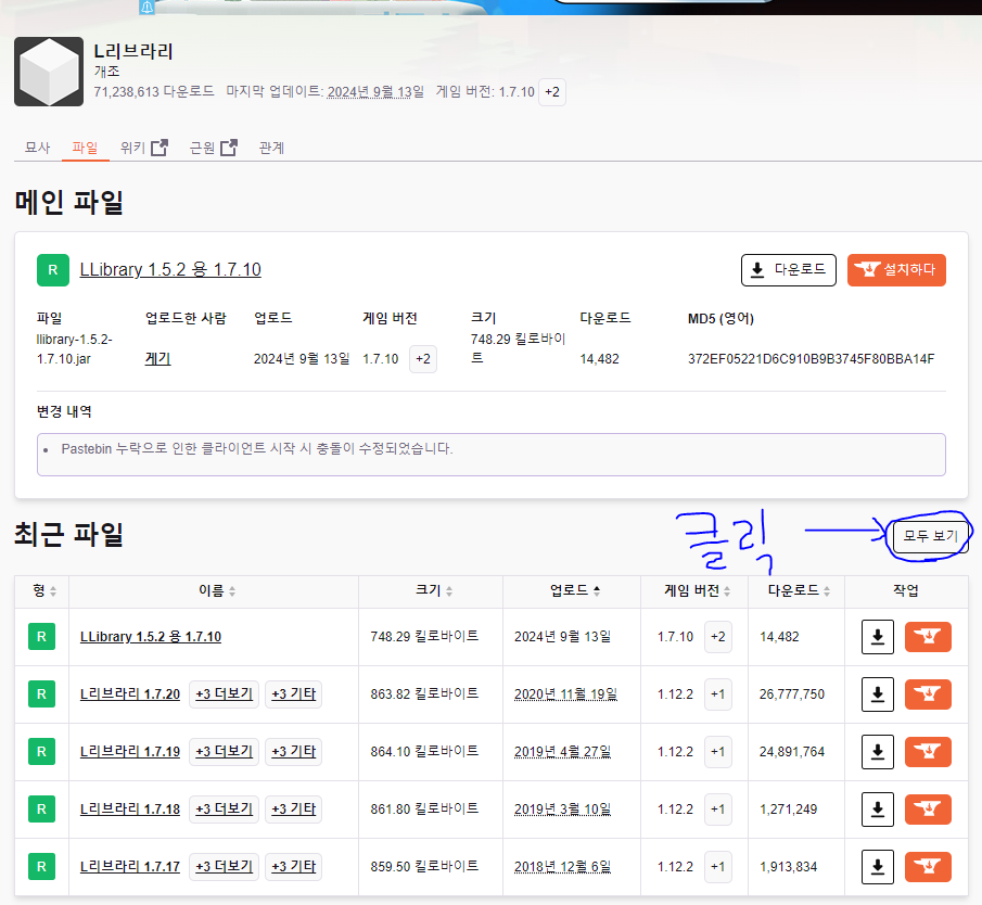 링크를 따라 파일 섹션으로 들어가면 다양한 파일들이 보입니다. 우리가 필요로 하는 것은 1.12.2 버전이지만, 자세히 보면 1.5.2나 1.7.10 버전용 파일들임을 알 수 있습니다. 따라서 우리가 필요한 버전에 맞는것을 찾기위해서 '모두 보기'를 클릭해야 합니다.