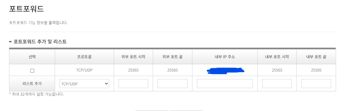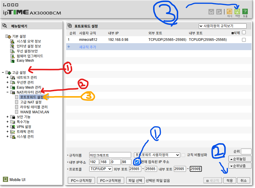 이후에 사진과같이 보이는 형식으로 "고급설정-NAT라우터관리-포트포워드 설정"으로 접속한다음에 규칙이름은 상관없고, 내부IP를 현재 접속된 IP주소로 체크한 뒤에 프로토콜에서 TCP/UDP로 설정하고 내부/외부 포트는 25565를 설정한 뒤 적용을누르고 혹시 모르니까 저장까지 누르면 포트포워딩은 성공입니다.