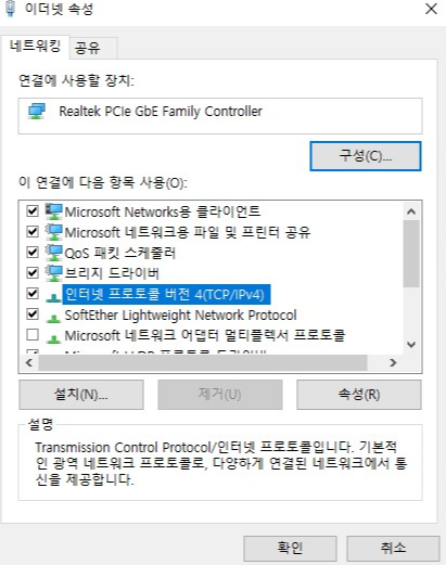 여기서 인터넷프로토콜 버전 4(TCP/IPv4)를 더블 클릭합니다.