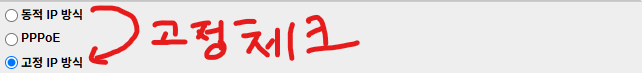 그런데 포트포워딩은 했지만 여러분들이 게임을 다하고 만약에 껏다면..?IP가 바뀔수도있기때문에 그런 변수를 줄이기위해서 기본 설정-인터넷설정 정보로 들어간다음 동적IP방식으로 켜져있을겁니다. 이걸 고정 IP로 바꾸시면됩니다.