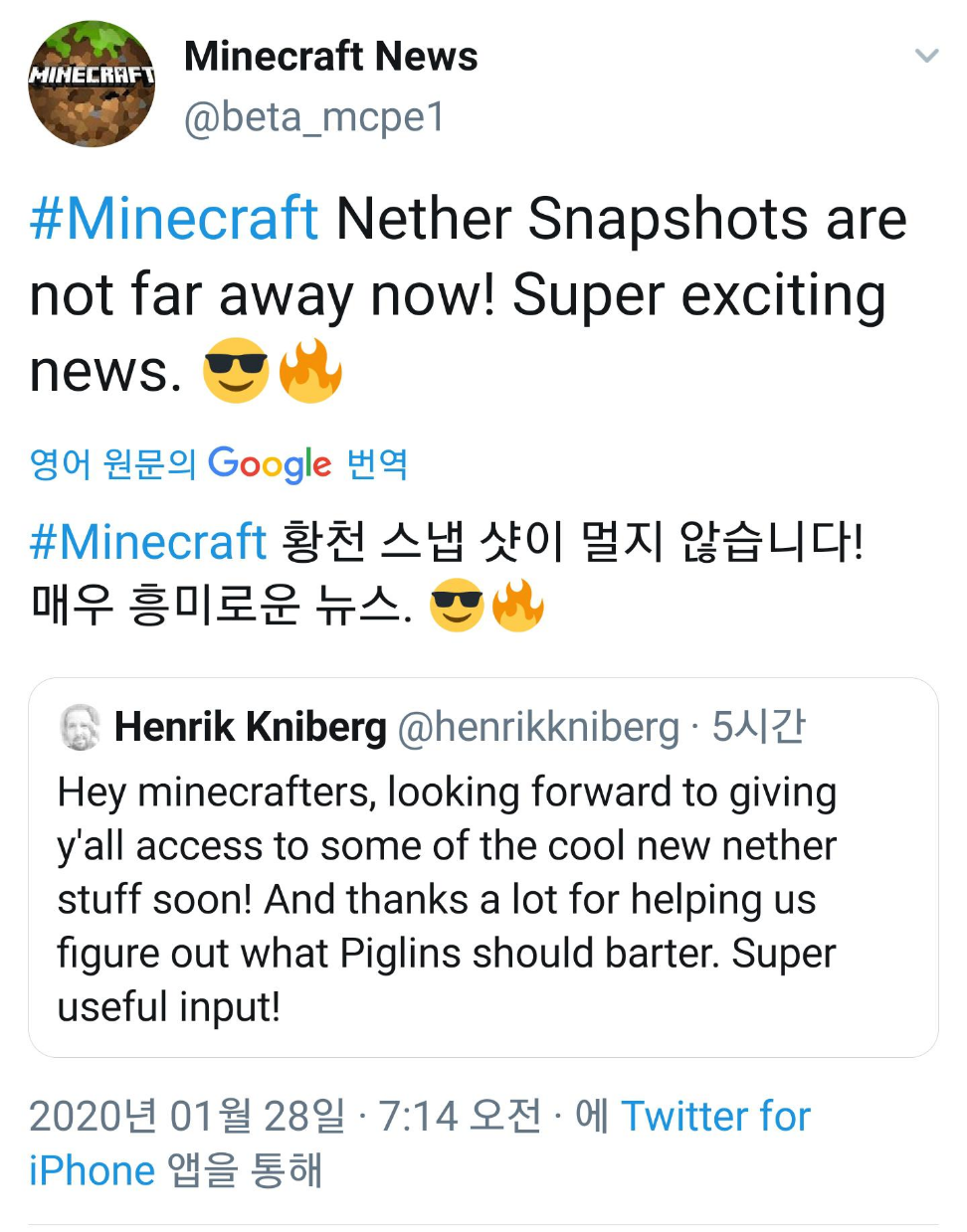 개발자가 의견을 수집하자 마인크래프트뉴스께서 네더스냅샷은 멀지않았다며 답장을했죠 이뜻은 곧 온다는 이야기입니다 무려2분뒤에 답장한것을 보아서는 아마도 일주일쯤?빠르면 일주일 늦으면 한3주뒤쯤?암튼 스냅샷이 공개된다니 곧 BE하고 같이 나올수있을거같네요^^ 아무리봐도 2월 안에는 나오지않을까 싶네요.