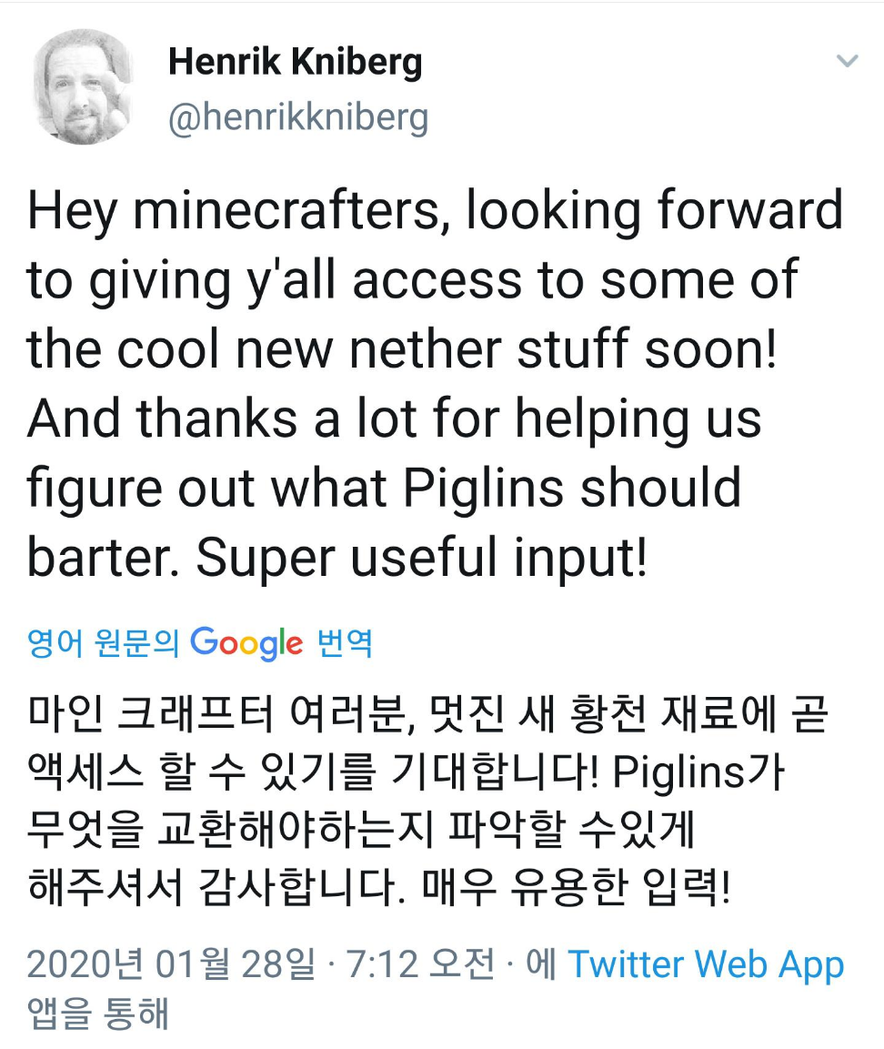 마인크래프트 개발자께서 네더업데이트에대한 따근한 소식을 오늘 오전에 알려주셨는데요 소식에따르자면 네더의 피그린에게 무엇으로 교환할지 사람들에게 물어봤습니다 그리고 파악가능하다고했죠 이뜻은 지금도 열심히 스냅샷을 만들고있는것입니다.