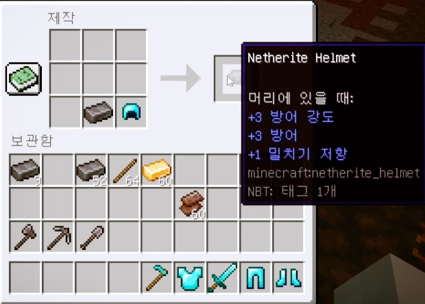 이런식으로 밀치기저항이 같이 붙으며 방어력도 올라갑니다 참고로 이템들은 용암이나 불에는 안타지만 선인장에는 닿으면 사라집니다 또한 인첸트를 붙이고 조합시 현재는 아이템의 인첸트가 사라집니다 그리고 새로운 영혼횟불과 영혼랜텀이 추가되었습니다 계속계속말하자면 네더라이트조합법은 저 갈색잉곳4개 금4개를 이용하여 조합할수있습니다 그리고 새로운 지형이 추가되었습니다
