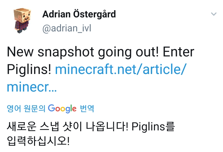 그들은 이쁘고 멋지다라고 말했습니다 위에 번역되어있으니 위내용은 걍 금갑바입으면 안맞고 주변에 피글린이 있을때 상자설치해서 열거나 설치되어있던것을 열어서 녀석들이 봤을경우 금갑옷입어도 얻어터지고요 그리고 금갑바는 신발,모자,갑바,바지중에서 하나골라서 다니면 돌아다니면서 지옥생활가능함 그리고 호글린비스트는 눈을 쳐다볼경우 때립니다 엔더맨처럼 그리고 피글린주변에 금을 떨구면 템을 주는데 그것들중에서 네더라이트가 나오고 나머지는 엔더진주나 자갈 그리고 흔히말하는 불필요템을 던짐 참고로 네더라이트는 교환으로 얻기힘듬 또하나 Tip은 네더라이트블럭으로 신호기활성화 가능 또한 BE업데이트가된다면 BE에도 높은 추가할기능일듯뭐 대충여기까지가 그리고 금괴도 왼손에 착용가능할수도;;