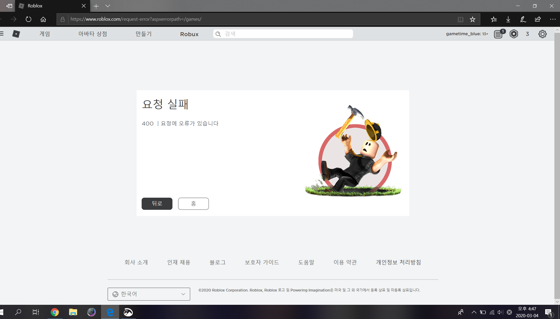 안녕하세요 오늘은 로블을 했었는데 서버가 터져서 올립니다 https://youtu.be/qLeTapub3Ok 이링크로타서 보시면 로블서버가 완전히 나간걸로 알고있었는데요 저는 이제 겜을 못합니다 로블이 털려서 맛이 나갔기때문에 마크도 삭제해서 이제 할겜이 완전히 사라진겁니다 이건 말이안됩니다 제가 서버터지기전까지는 로블록스가 잘돌아갔습니다 그리고 이건 저 뿐만이 아닌 다른사람들도 서버가 터졌다는군요 아무래도 코로나가 서버에까지퍼져서 아래 사진을 보시면 마이크로소프트 엣지를 사용하는데 그것도 안들어가지고 크롬도 안들어갑니다 (지금 갑자기 복구되서 확인을 못했습니다)
